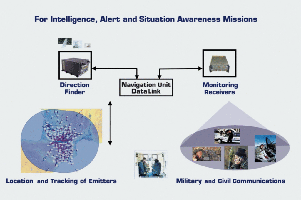 Il est basé sur une interception et une radiogoniométrie hautes performances, une surveillance multicanal, une géolocalisation automatique des cibles en mouvement et une classification automatique en temps réel de tous les signaux civils et militaires.